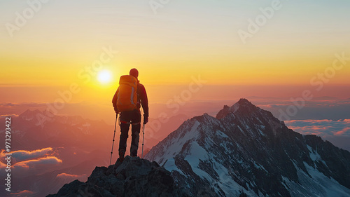 A hiker reaching summit of mountain at sunset, feeling accomplished and inspired