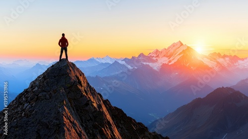 A hiker standing on a rocky outcrop overlooking a stunning mountain vista at sunset