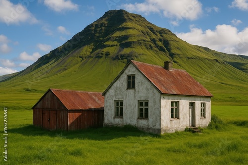 summer, nature, house, grass, landscape, home, building, mountain, green, architecture, blue, farm, old, stone, europa, wooden, traditional, turf, village, rural, history, icelandic, bungalow, country, northern, rustic, north, exterior, iceland, small, typical, viking
