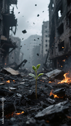 A hopeful sprout grows amid the remains of a collapsed cityscape after war, surrounded by glowing embers and thick shadows