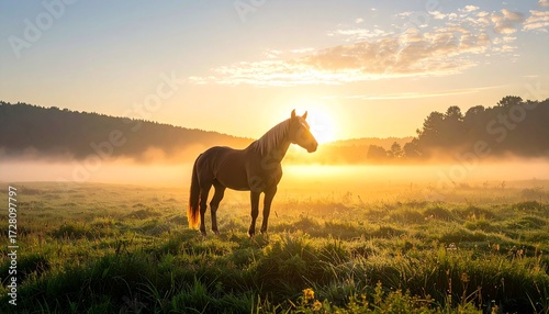 A horse standing in a misty meadow at sunrise, ultra realistic, high-resolution photography