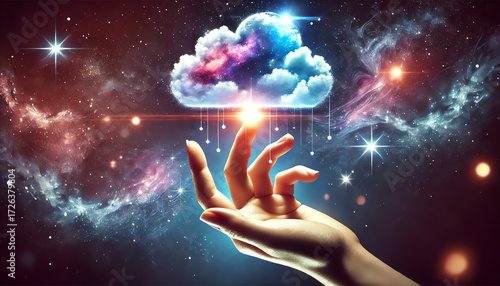 A human hand reaching up and gently touching a glowing, semi-transparent cloud icon