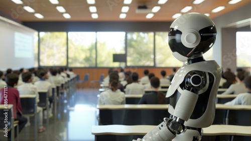 technology, education, classroom, modern, attentive, robot, learning, futuristic, innovation, student, higher education, ai, academic, lecture hall, teaching, advancement, robotic, class, school, artificial intelligence, future, machinery, cognition, study, educational