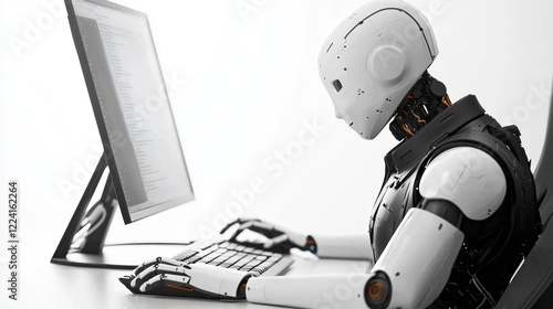 A humanoid robot interacts with a computer, symbolizing advancements in artificial intelligence and technology in modern workspaces.