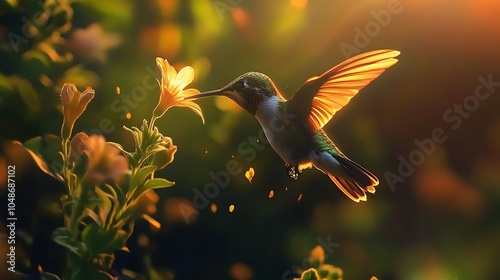 A hummingbird nourishes itself by feeding on beautiful flowers.