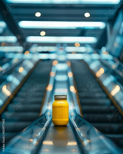 A jar of honey sits on a moving escalator in a brightly lit space.