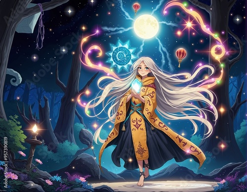 star, mystical, ancient, magic, woman, folklore, wisdom, fantasy, cosmic, starry, rune, mystery, long, wise, forest, wonder, guardian, light, nature, shadow, sky, beauty, symbol, dream, illumination, hair, spirit, scene, journey, protection, beautiful, cloak, enchanting, aethereal, enchantress, night, element, calmness, adventure, harmony, serenity, magical, moonlight, mythical, flowing, vector, illustration, fashion, art