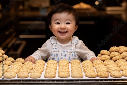 A joyful baby enjoys the moment among rows of delicious cookies on a table