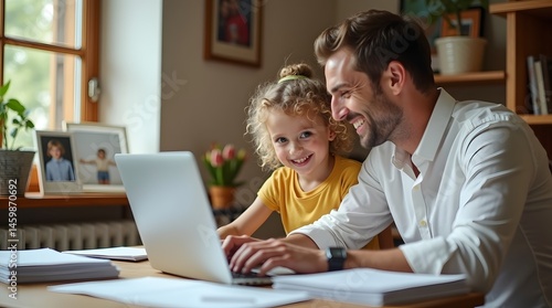 A joyful Caucasian father and daughter share a fun moment while working on a laptop at home, surrounded by family photos.