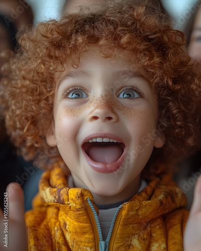 A joyful child with curly hair and freckles, expressing excitement and happiness.