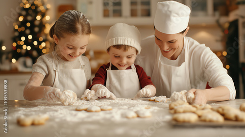 A joyful family baking cookies together during the holidays, surrounded by festive decorations. A perfect moment of laughter and creativity in the kitchen.