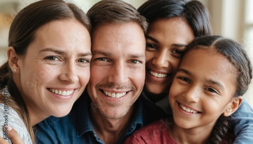 A joyful group of four people smiles close together, showcasing happiness and connection. Their diverse backgrounds highlight friendship and shared moments in a warm atmosphere