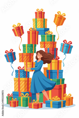 A joyful person amidst a mountain of beautifully wrapped gifts, showcasing the spirit of celebration, surprise, and the joy of giving during special occasions and festivities.
