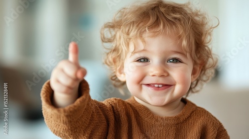A joyful toddler smiling and giving a thumbs up gesture at home, representing happiness and childhood innocence, making it a delightful image for family themes.