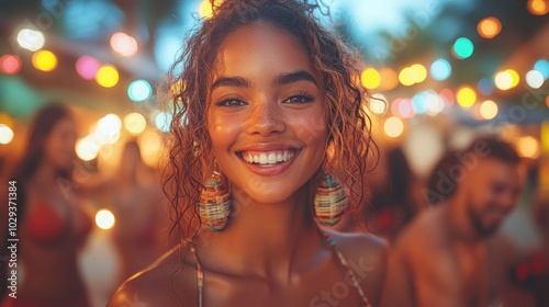 woman, smile, party, light, happiness, celebration, joy, friends, fun, summer, laughter, music, atmosphere, colourful, earring, fashion, beauty, youth, energy, excitement, community, social, festival, portrait, expression, coiffure, mood, culture, gathering, relaxation, enjoyment, vibe, event, nature, scene, diverse, ambience, cheerful, festive, carefree, playful, interaction, lifestyle, engagement, connection, warmth, evening
