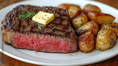 A juicy medium-rare steak with a sprig of rosemary and a pat of butter, served with roasted potatoes on a white plate.