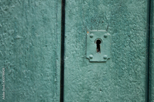 A keyhole in a wooden green door in the historic center of Rio de Janeiro