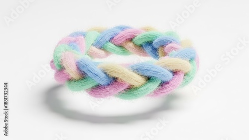 A knitted bracelet with pastel colors, featuring a braid pattern, against a white background.