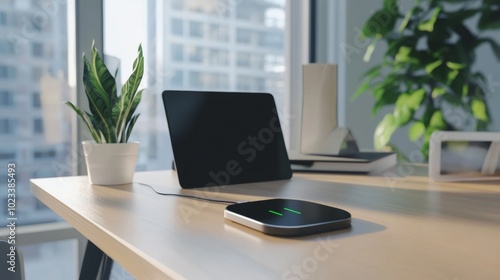 laptop, sit, desk, next, plant, black, green, technology, computer, digital, wood, business, window, modern, table, notebook, background, device, phone, smartphone, wooden, office, connection, workplace, equipment, work, communication, battery, screen, wireless, charge, desktop, electronic, mobile, display, charger, smart, white, design, pad, cable, induction, blank, room, object, space, innovation, home, portable