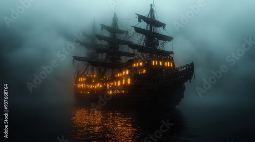 A large, eerie ghost ship with glowing windows sails through dense fog at night, creating a chilling and mysterious atmosphere.
