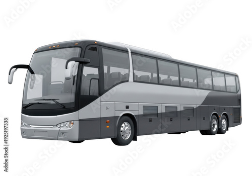 A large grey bus with a long body and many windows isolated on transparent background