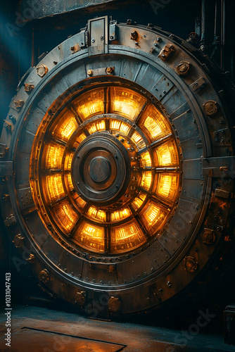 vault, door, circular, industrial, orange, visual, mystery, unique, illumination, exploration, shine, machinery, element, to illuminate, atmosphere, glow, dramatic, futuristic, warm, security, engineering, effect, aesthetic, intricate, precision, hardware, shadow, entry, contrast, scene, labyrinth, artistry, chamber, secret, reveal, energy, depth, light, technology, space, style, design, metal, texture, pattern, beauty, construction, environment, architecture