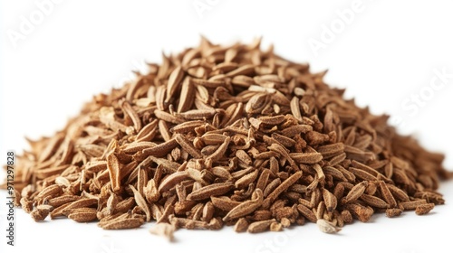 A Large Pile of Ground Cumin Seeds on a White Background Showcasing Their Rich, Earthy Color