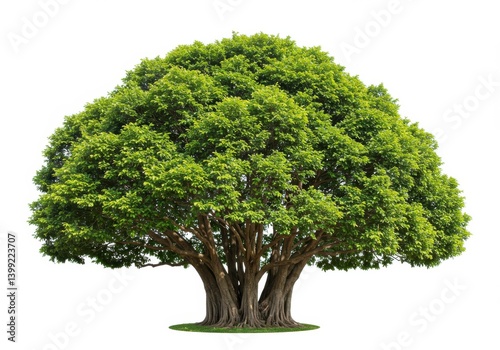 A large tree with a full green canopy and multiple trunks isolated on a white background in the daylight