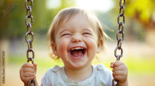 A laughing kid playing on a swing in a sunny park./