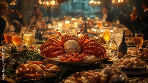 seafood, feast, dining, table, lobster, shrimp, oyster, wine, goggles, candle, elegance, celebration, epicure, cookery, party, luxury, decor, gathering, friends, atmosphere, indulgence, variety, platter, appetiser, socialising, evening, banquet, delicious, fresh, seafood, presentation, favor, enjoyment, festive, culinary, ambience, rich, opulent, herb, garnish, texture, colours, warmth, hospitality, joy, sharing, life events, tradition