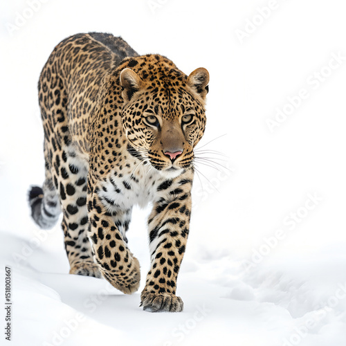 leopard, walking, snow, yellow, fur, black, spot, white, background, animal, wild, predator, felino, winter, isolated, cold, nature, majestic, powerful, elegant, stealthy, camouflage, motion, mammal, spotted, wilderness, snowy, graceful, strong, paw, alert, environment, icy, realistic, creature, hunting, crisp, wildlife, stride, beautiful, natural, solitary, confident