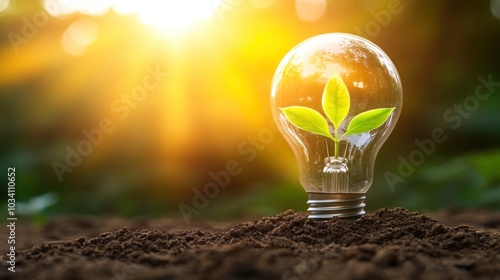 light bulb, germinating, growing, plant, leaf, green, dirtied, earth, nature, environment, sustainable, renewable, energy, future, life, growth, bright, idea, hope, change, innovation, conservation, protection, sun, light, background, outdoors, photo, concept, abstract, symbol, inspiration