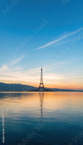a lighthouse on a calm lake at sunset with tower photography