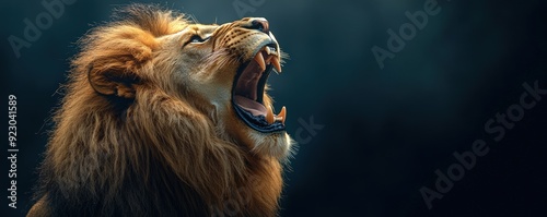 A lion is roaring with its mouth open. The lion is in a dark background. The lion is the main focus of the image