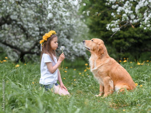 a little caucasian beautiful girl in denim shorts and a white t-shirt sits and hugs a dog golden retriever labrador in flowering gardens in the park. The dog is man's best friend.