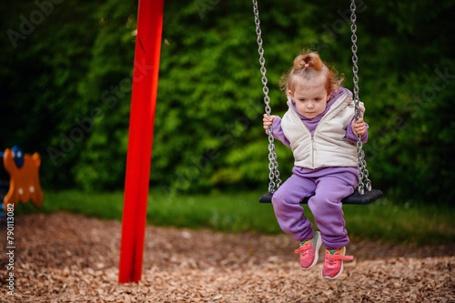 first, swing, adventure, toddler, joy, playground, hold, soft focus, gaze, newness, excitement, activity, leisure, fun, children, grip, playtime, life events, motion, purple, jacket, tree, nature, discovery, childhood, learning, cautious, anticipation, amusement, woodchips, ground, equipment, safety, enjoyment, exploration