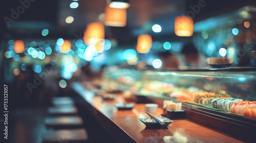 A Lively Sushi Restaurant Interior Featuring Glowing Counter with Assorted Sushi and Charming Atmosphere
