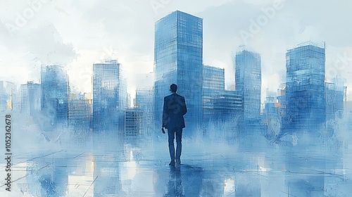 businessman, city landscape, skyscraper, mist, digital, skyline, atmospheric, solitary, futuristic, future, solitude, contemplation, vision, progress, ambition, growth, potential, architecture, modern, urban, technology, innovation, towering, perspective, isolation, blue, artistic, dreamlike, metropolis, inspirational, modernism