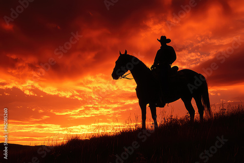A lone cowboy silhouetted against a fiery sunset, a testament to the rugged beauty of the American West.