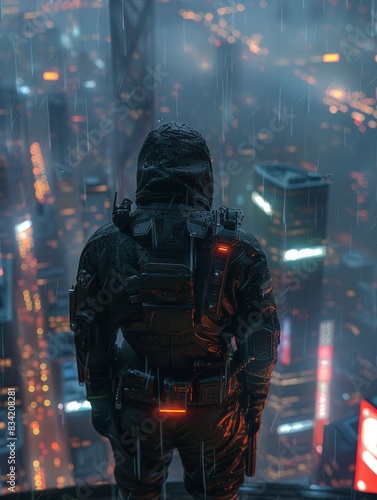 A lone figure in a futuristic suit overlooking a neon-lit cityscape on a rainy night