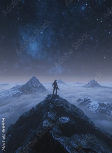 A lone figure standing atop an alpine peak, gazing at the starry sky with a camera in hand. The scene is set against a backdrop of distant mountains and clouds under the Milky Way