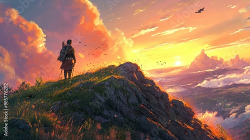 figure, cliff, sunset, vale, sky, cloud, orange, yellow, red, purple, blue, green, grass, mountain, mist, fog, horizon, light, sun, nature, landscape, artwork, painting, digital, art, fantasy, adventure, travel, wanderlust, serene, peaceful, tranquil, awe, beauty, solitude, hope, inspiration, dream, journey, destination