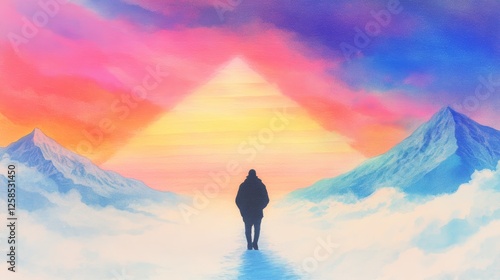 surreal, landscape, mountain, sunset, pyramid, light, figure, silhouette, person, walking, dreamlike, mystical, peaceful, pink, orange, yellow, blue, colourful, vibrant, hope, journey, aspiration, calmness