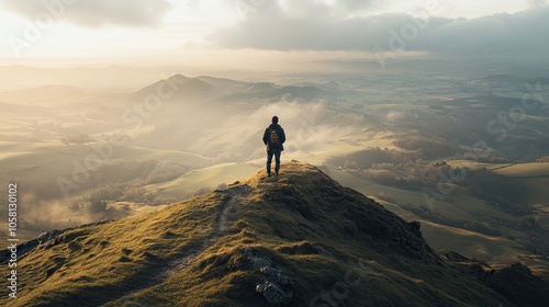 hiker, man, mountain, peak, top, vale, fog, mist, sunset, cloud, sky, horizon, landscape, hill, field, grass, tree, nature, outdoors, travel, adventure, scenery, scenic, wilderness, rural, remote, dramatic, majestic, huge, aerial, view, perspective, alone, solitude, peaceful, serene, calmness