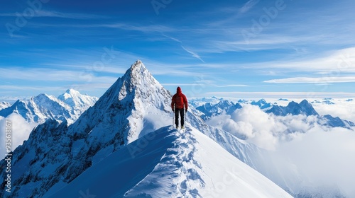 A lone hiker stands atop a snowy mountain peak, surrounded by clouds and breathtaking views, capturing the essence of adventure.