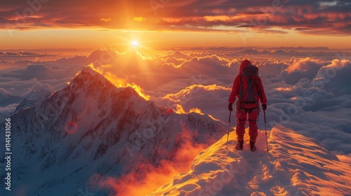 A lone hiker stands on a snow-covered mountain peak, silhouetted against a fiery sunset over a sea of clouds. AI generative.
