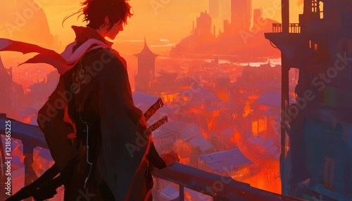 samurai, city landscape, sunset, fire, orange, red, silhouette, lone, warrior, japan, asia, fantasy, artwork, digital, painting, art, illustration, background, scene, view, horizon, sky, cloud, building, house, rooftop, tower, structure, ancient, old, modern, futuristic, blend, contrast, colours, vibrant, intense, dramatic, moody, atmosphere, feeling, emotion, mysterious, serene, peaceful, calm, calmness