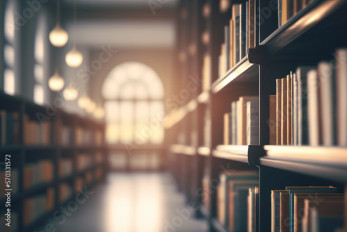 A long bookshelf filled with lots of books, blurry background, Generative AI