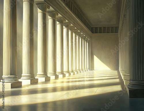 A long row of Greek-style columns in an empty room with smooth stone walls and floor, bathed in sunlight from the side, creating a sense of grandeur and symmetry.