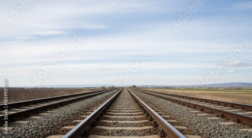 long, straight, distance, track, field, blue, sky, clear, train, grass, railway, grassy, stretches, side